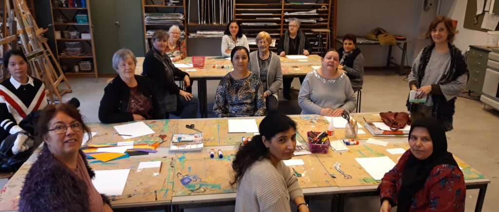 ** Vijftien enthousiaste vrouwen die deze week begonnen aan een serie kunstlessen in het Cultuurbedrijfbij van docent Su Kroker.