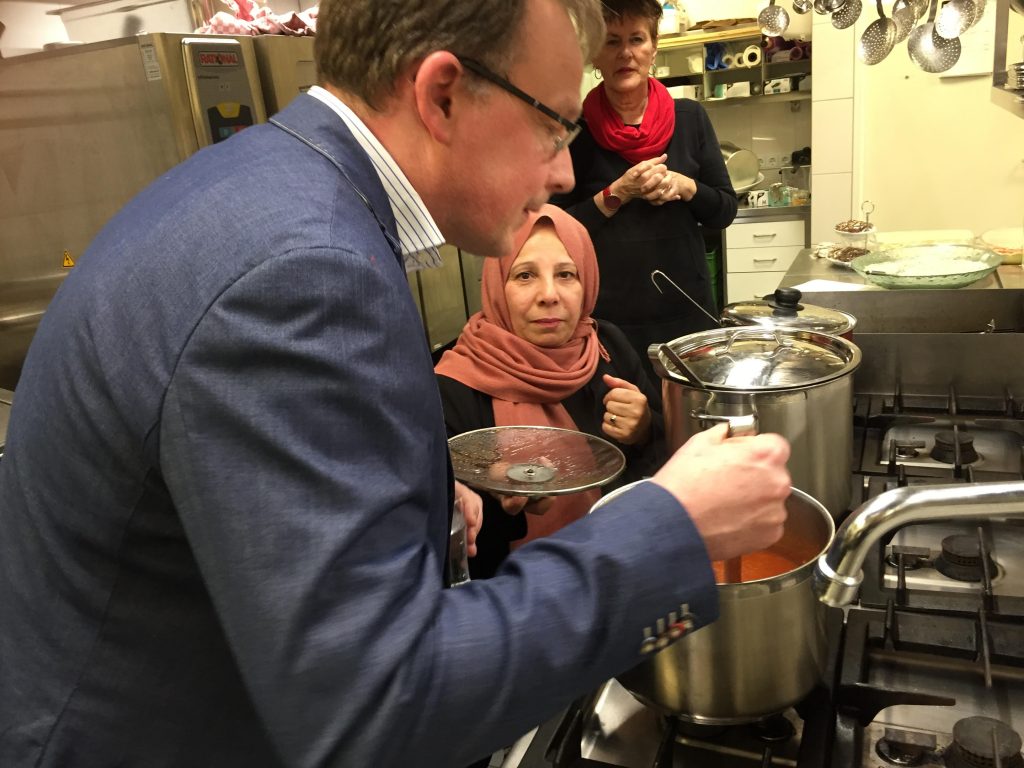 ** Irakees koken voor de Netl Nieuw Initiatief avond zaterdag jl. Onze nieuwe burgemeester Bouman nam een voorproefje in de keuken. De avond was weer top: een Wereldbuffet en lezing over Wereld & Milieu.